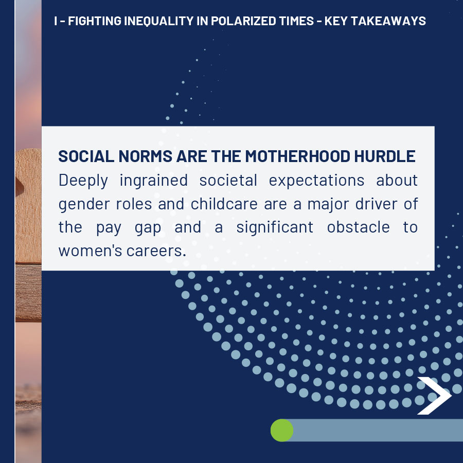 The discussion then turned to the root causes of the pay gap, identifying two major hurdles: motherhood and social norms. Prof. Fuchs-Schündeln explained that a significant portion of the pay gap emerges after women become mothers. She distinguished between personal preferences and social norms, defining a norm as a social expectation that is costly to defy. For example, while it is the norm for men to be the primary full-time earner, it is often still the norm for women to be the primary caregiver.
