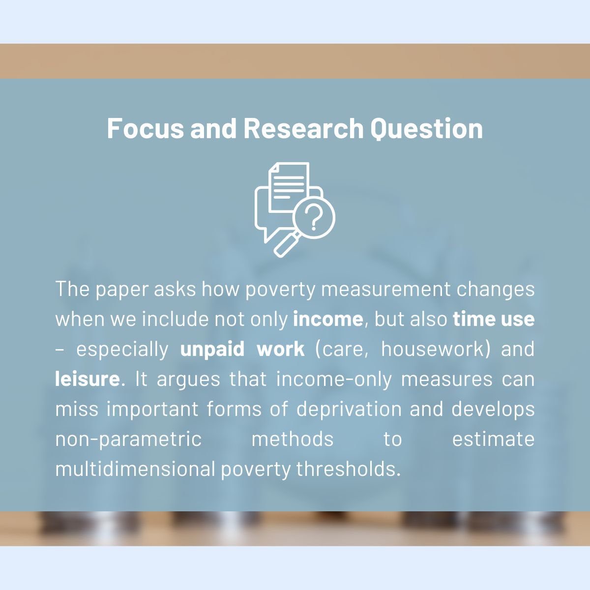 The paper takes a different approach. Its main innovation is to define poverty directly from the joint distribution of income and time. Rather than setting separate thresholds, the authors identify combinations of resources that are insufficient given the actual distribution of income and time in society.