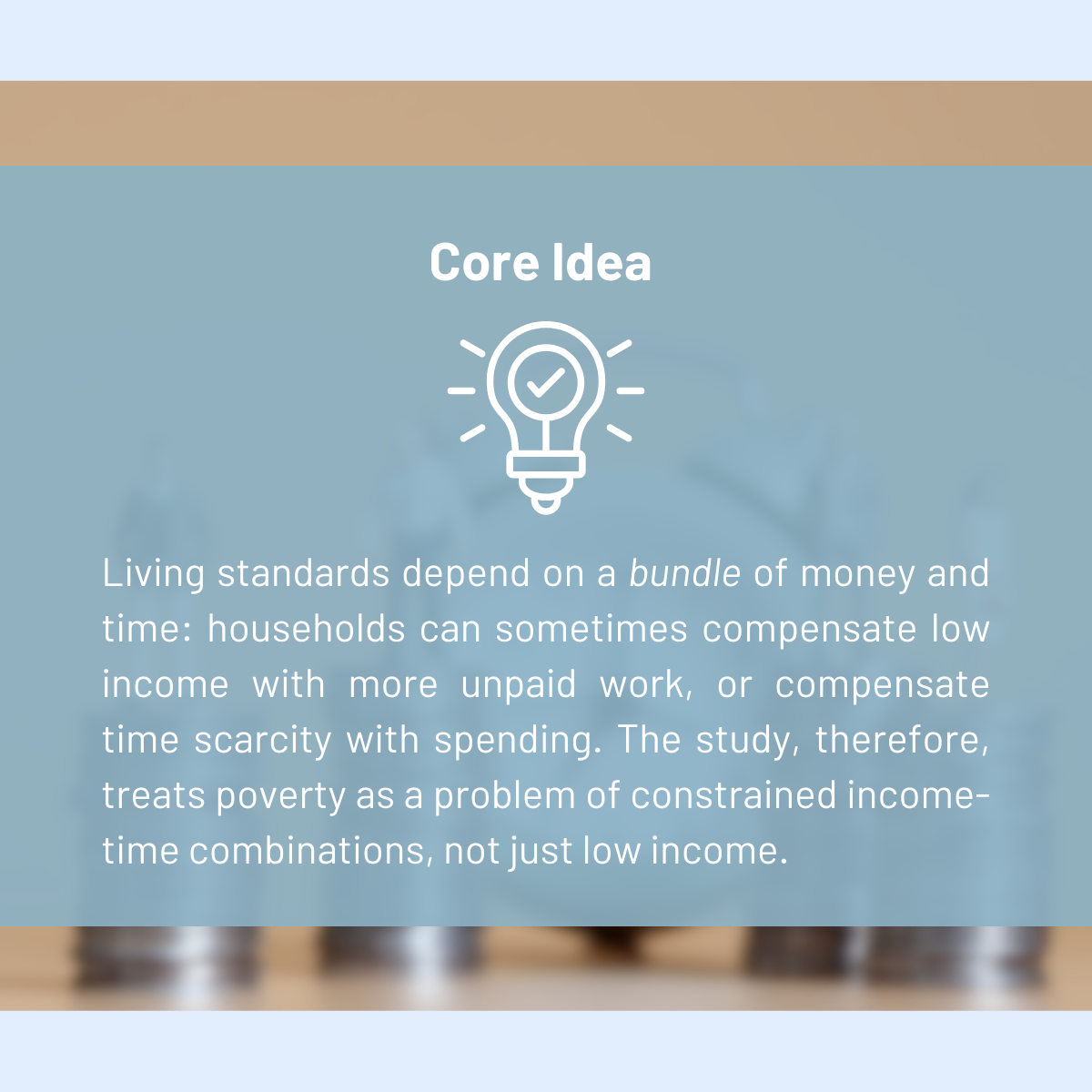 The key point is that income and time interact. Households may cope with low income by increasing unpaid work instead of buying services. Others may cope with time scarcity by spending more money. Poverty measures that ignore this interaction risk underestimating deprivation.