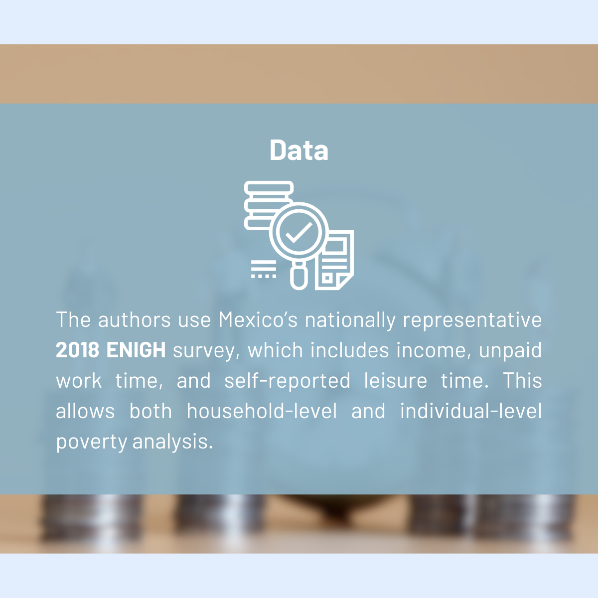The method is applied using data from the 2018 Mexican National Survey of Household Income and Expenditure (ENIGH). The survey is well-suited to this purpose because it includes detailed information on income, unpaid work, and leisure time.