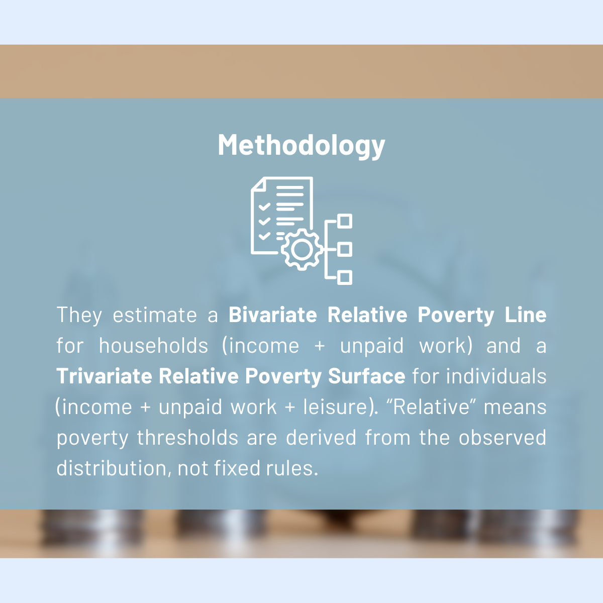 At the household level, they construct a Bivariate Relative Poverty Line (BRPL) that combines income and unpaid work. “Relative” means that poverty is assessed based on observed combinations of income and unpaid work across households, rather than against an externally fixed standard. This makes it possible to identify households that appear non-poor in each dimension separately but are poor when both are considered together.