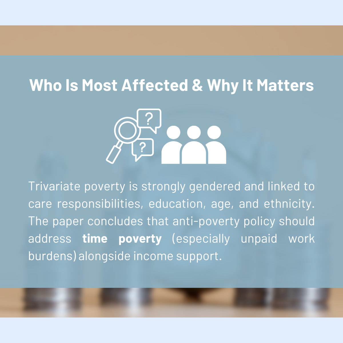 Policies that focus only on earnings or employment may overlook unpaid work – especially care work – that limits real opportunities. By providing a method that makes time-related deprivation visible, the paper demonstrates that effective poverty reduction should address income poverty and time poverty together.
