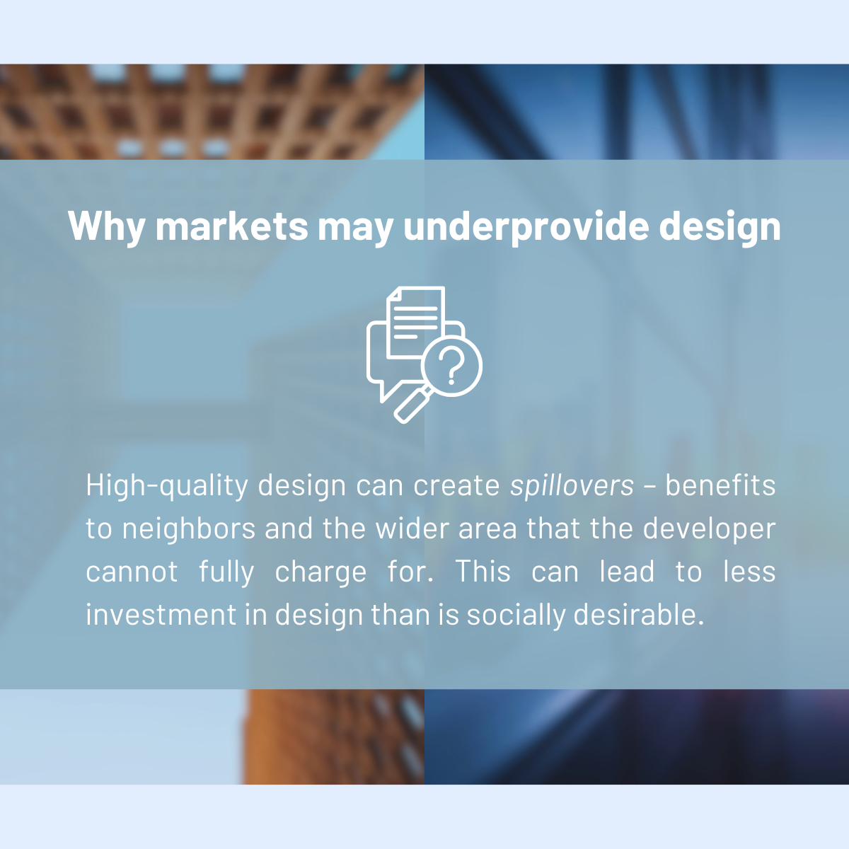 This distinction matters for policy. If design only benefits the building owner, it is mainly a private choice. But if design also raises surrounding values, there is a stronger case for public intervention – because the benefits are shared.