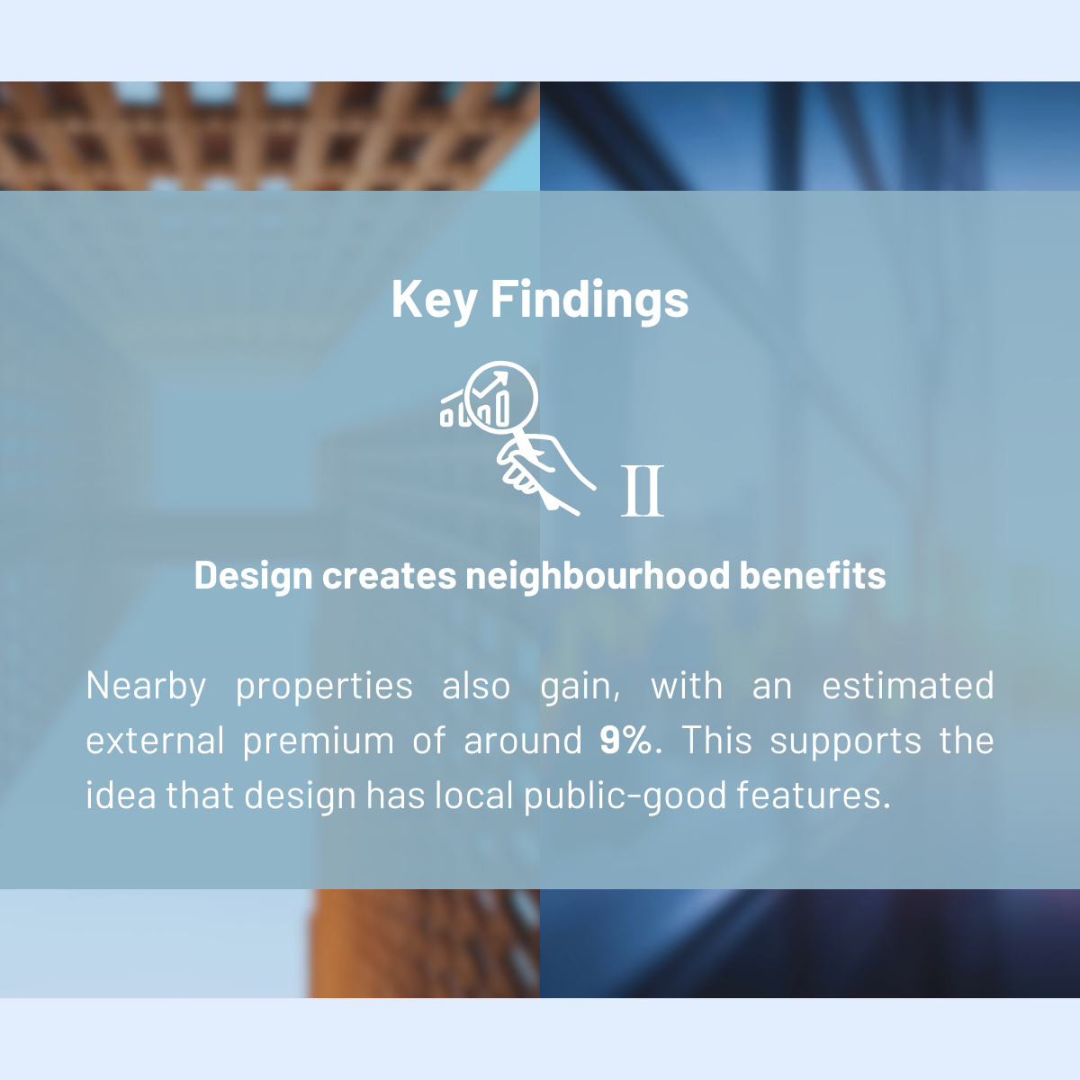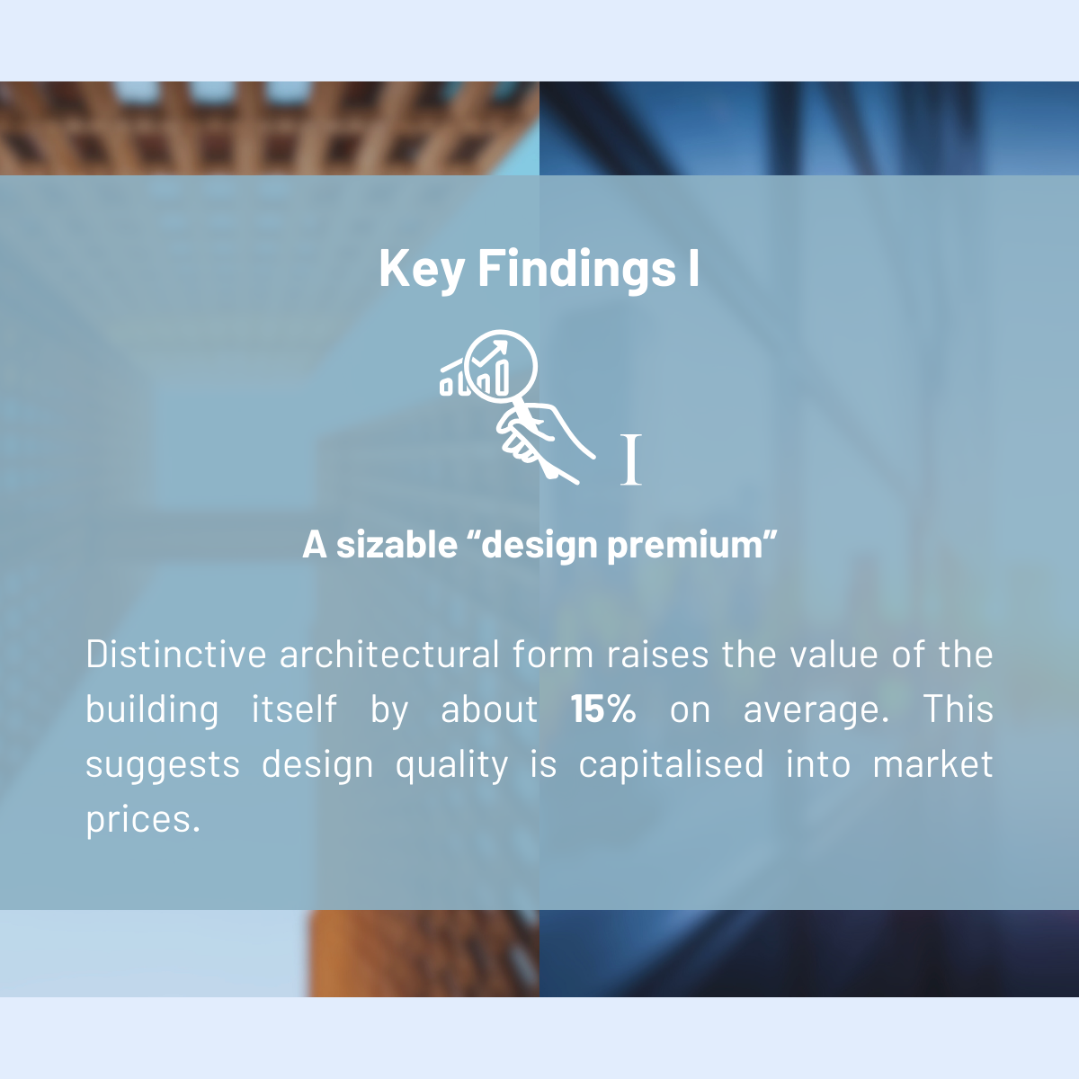Across the evidence reviewed, the authors find that distinctive architectural form is associated with meaningful price differences. Their preferred estimate suggests that distinctive design increases the value of the building itself by about 15% on average.