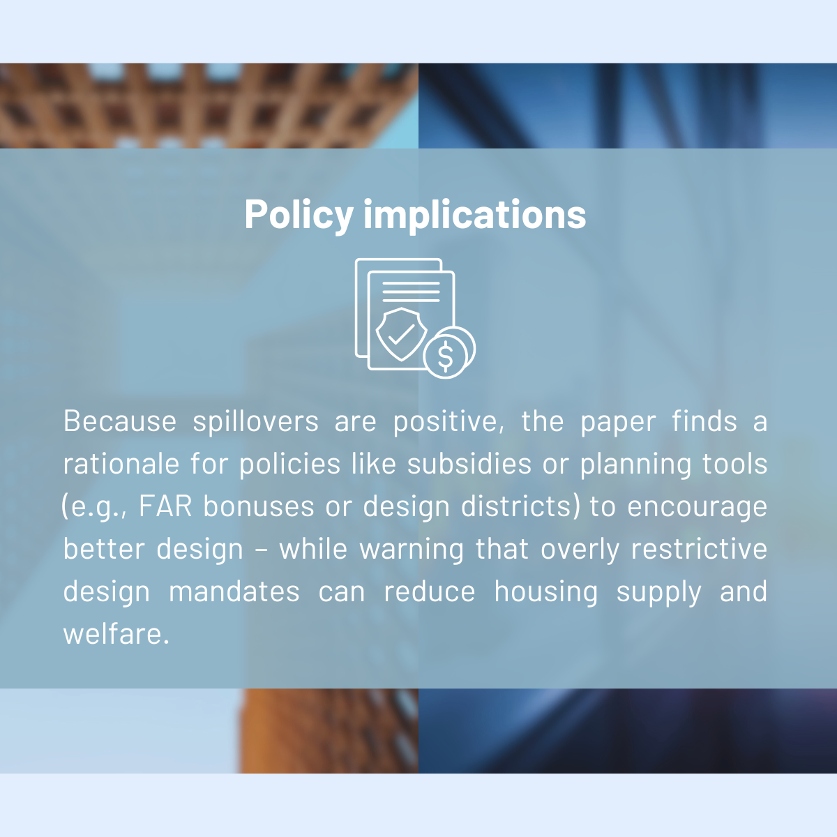 One clear message is that policies can increase distinctive design, but design policy is not automatically welfare-improving. Some tools raise architectural quality but reduce housing supply, which can push up rents.