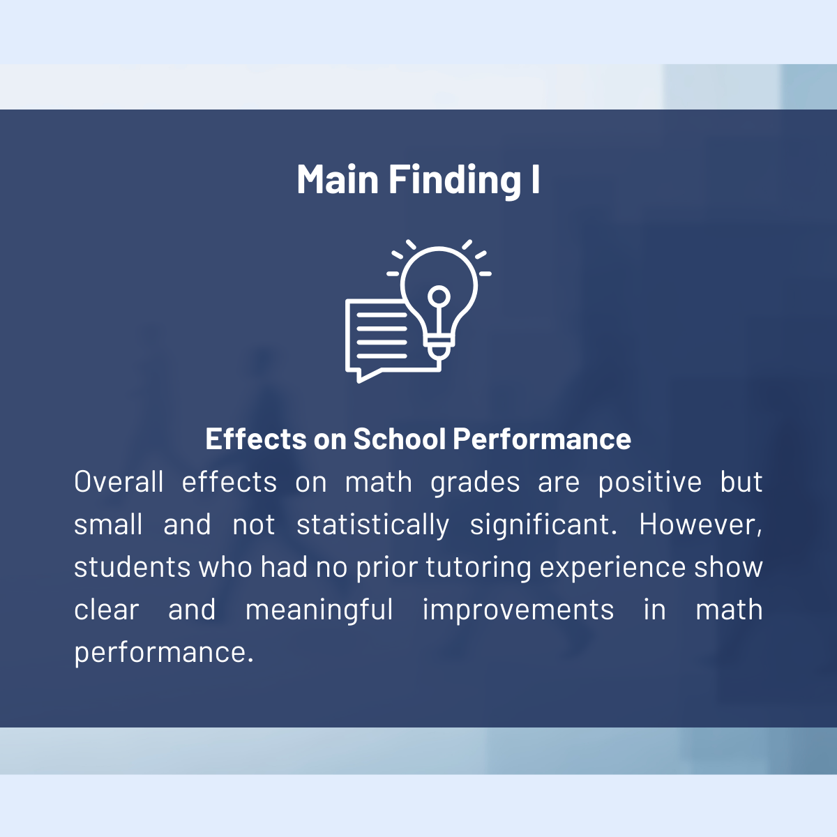 The results on grades are nuanced. On average, the tutoring offer led to small improvements in math grades, but these were not statistically significant for the full sample. However, for students who had not received any tutoring before the program, the effects were larger and clearly positive. For this group, online tutoring significantly improved math performance and reduced the likelihood of repeating a grade.
