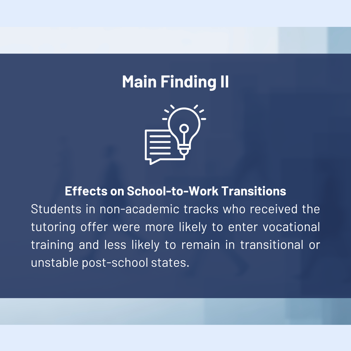 More striking are the findings on school-to-work transitions. Among students in non-academic school tracks, those who received the tutoring offer were more likely to enter vocational training eighteen months later. At the same time, they were less likely to remain in the so-called transition system—programs that often delay entry into formal training and are associated with weaker long-term prospects.