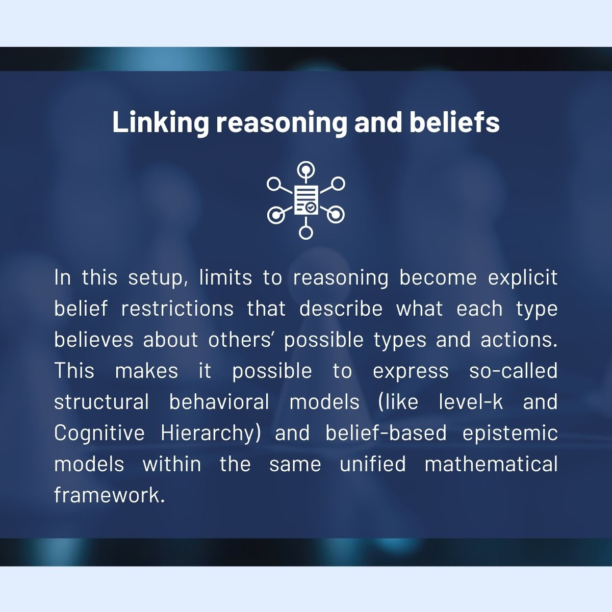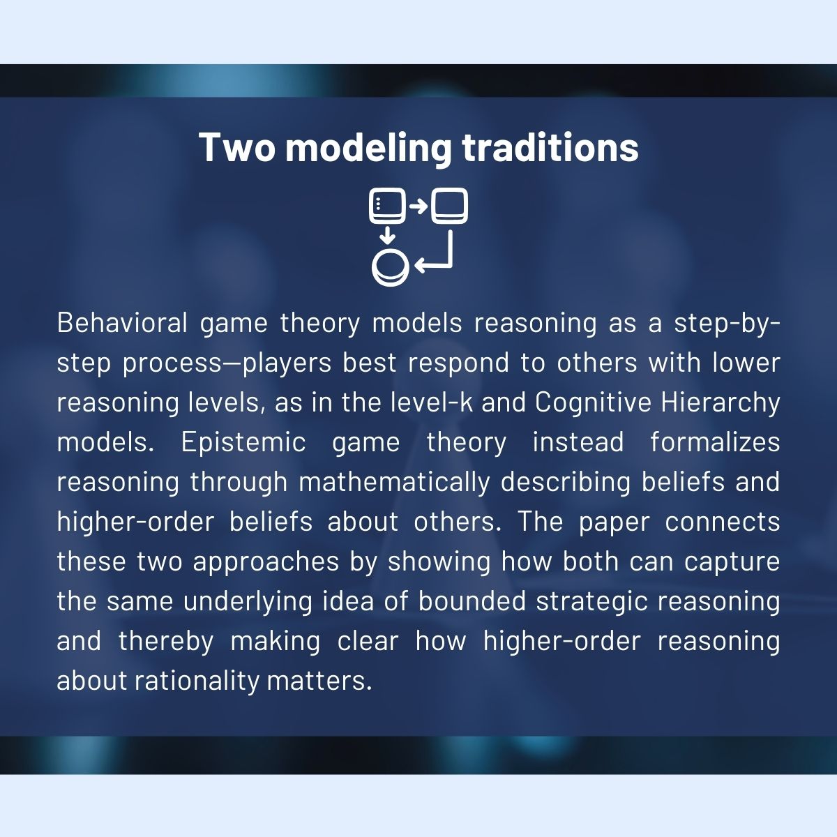 The authors start from two existing ways to model reasoning. The first, used in behavioral game theory, describes reasoning as a sequence of steps. In the level-k model, for example, a “level-0” player acts without strategy, a level-1 player best responds to that, a level-2 player reacts to the level-1 player, and so on. The second, used in epistemic game theory, formalizes reasoning through belief hierarchies—what each player believes about others’ actions and beliefs, and what others believe about them, and so on. Both approaches capture strategic reasoning but describe it in very different formal languages.
