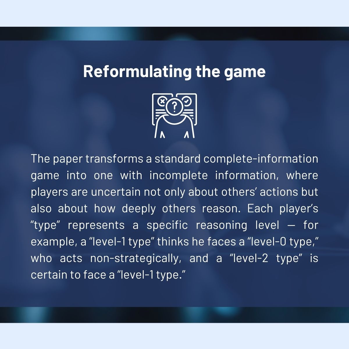 Liu and Ziegler’s key contribution is to show that these two perspectives can be expressed in one unified model. They reformulate a standard game to include not just uncertainty about what others will do, but also about how deeply others reason. Each player is assigned a “type” that represents their reasoning level—directly describing what they think about the level of their co-players. For instance, a player might be a “level-1 type,” meaning they assume others are a “level-0 type” playing non-strategically according to an exogenously specified anchor. In turn, a “level-1 type” assumes that others are of “level-2”. This setup turns limits to reasoning into clear belief restrictions that describe what each type believes about others’ possible types and actions.