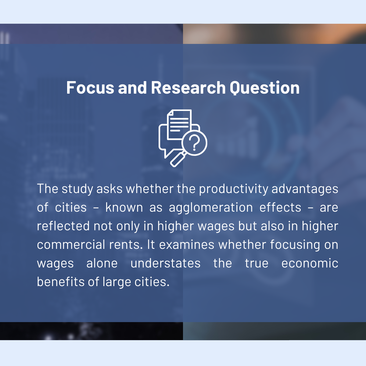 Most previous research has focused on wages to measure the benefits of city size. Wages are easier to observe and compare across regions. However, firms also compete for scarce floor space in central locations. If productivity is higher in these locations, firms may be willing to pay more in rent. Ignoring this channel may therefore underestimate the full economic impact of agglomeration.