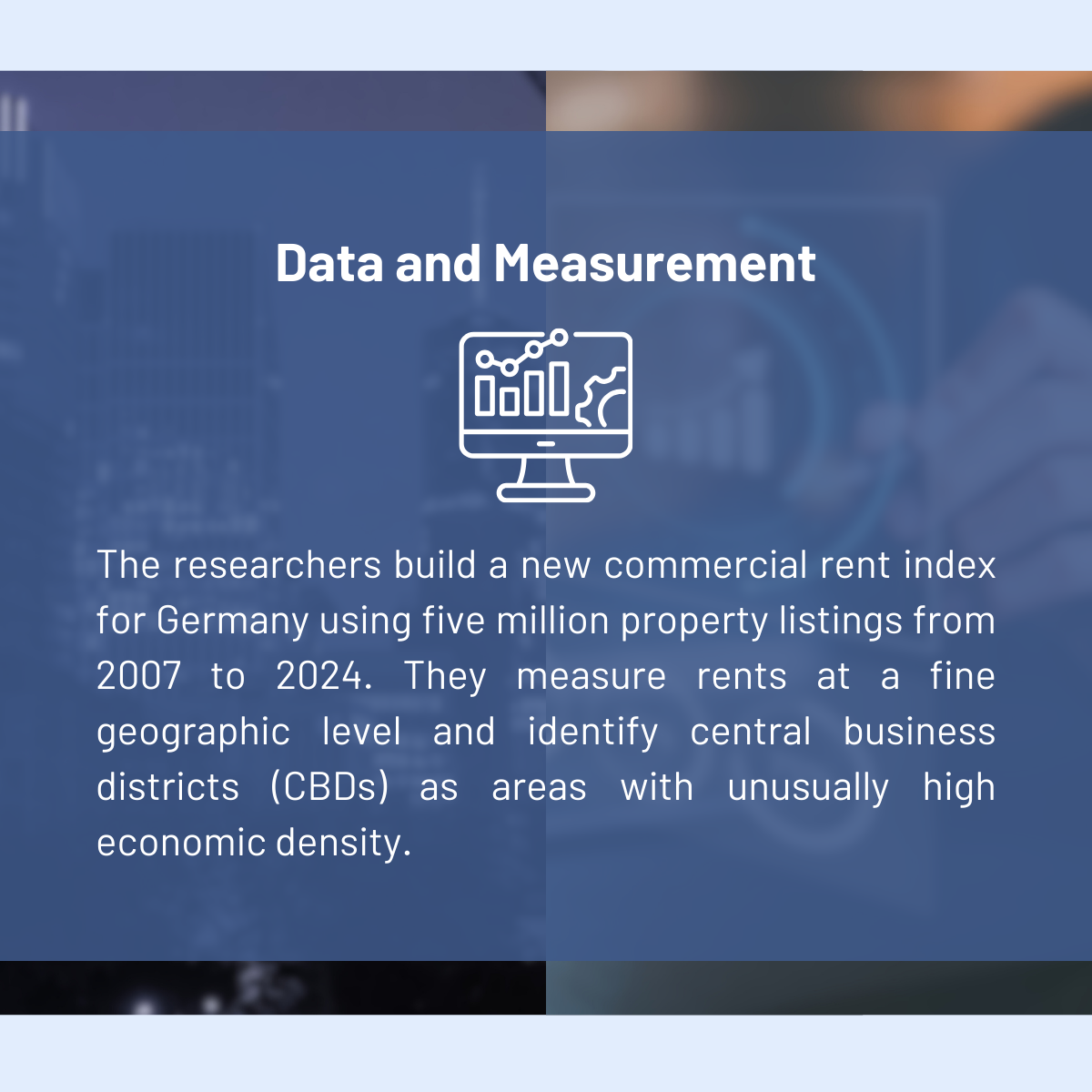 To answer this question, the authors construct a new commercial rent index for Germany. They use five million commercial real estate listings from the online platform Immobilienscout24, covering the years 2007 to 2024. The data allow them to measure rents at a very fine geographic level – down to individual postcode areas.