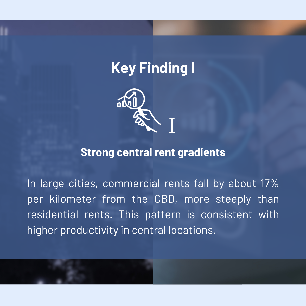 The first result concerns spatial patterns within cities. In large German cities, commercial rents decline by about 17 percent per kilometer as one moves away from the CBD. This decline is steeper than for residential rents. The pattern suggests that firms value central locations highly, consistent with higher productivity in these areas.