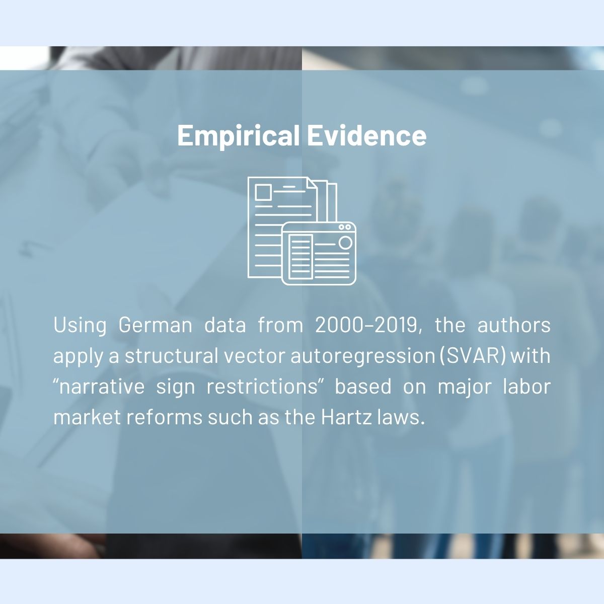 To investigate this, the study combines empirical analysis with theoretical modeling. It first uses German data from 2000 to 2019 in a structural vector autoregression (SVAR) that applies narrative sign restrictions to identify major exogenous policy changes, such as the Hartz reforms. It then develops an overlapping-generations model with job-search frictions and age-specific saving behavior to explain the empirical patterns.