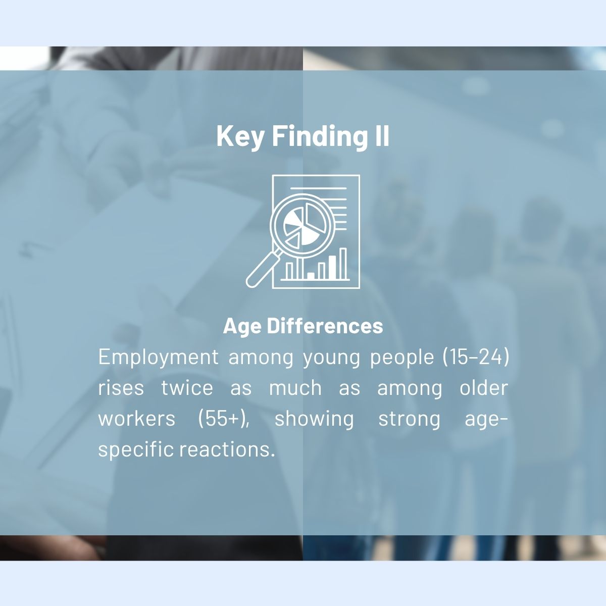 The empirical results show that benefit cuts in Germany have been followed by persistent declines in unemployment and, over the medium term, a small but measurable fall in real interest rates (around 0.1 percentage points). The effects vary by age: unemployment among young workers (15–24) decreases roughly twice as much as among older workers (55 and above). This suggests that young job seekers, who are typically more flexible and responsive to hiring incentives, play a key role in transmitting benefit reforms to the wider economy.