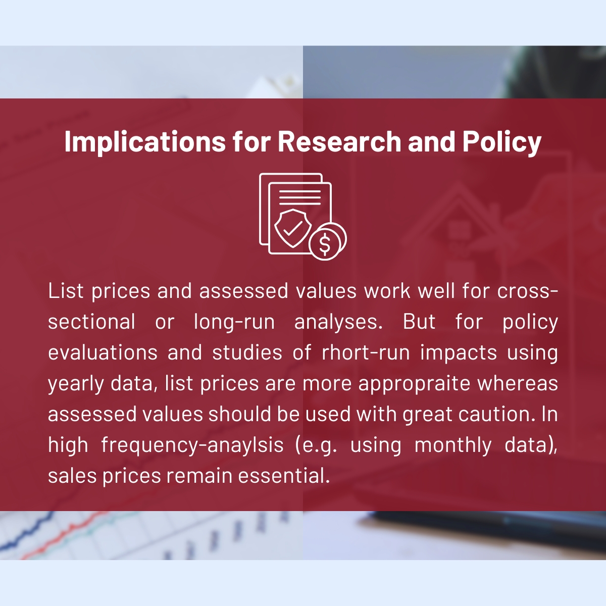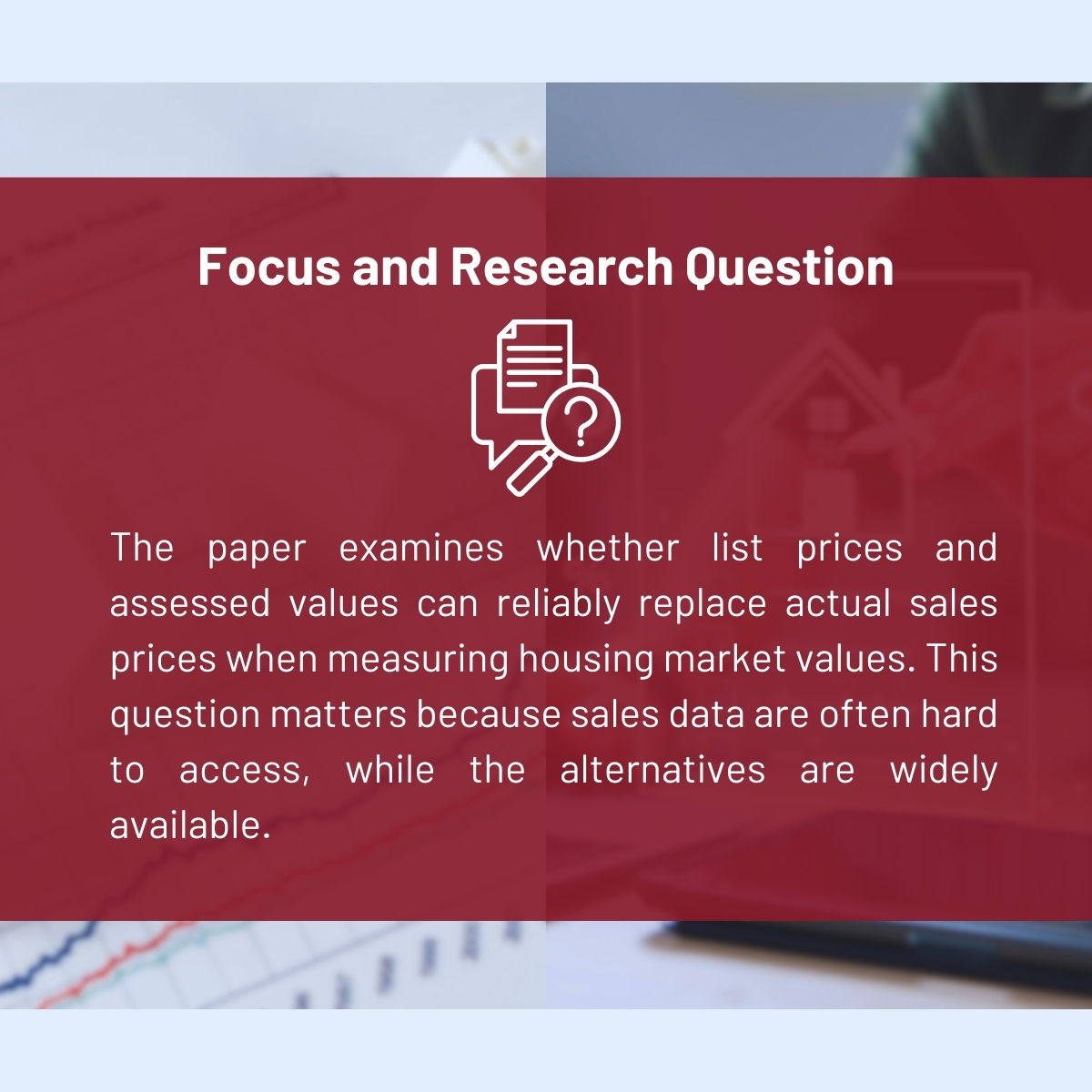 Sales prices—the prices at which homes are actually sold—are widely considered the best measure of housing values. Yet such data are often unavailable, incomplete, or difficult to access, especially for small areas or long time spans. As a result, researchers frequently rely on list prices (asking prices set by sellers) or assessed values (prices determined for tax purposes). The study examines how this choice of data affects empirical results.